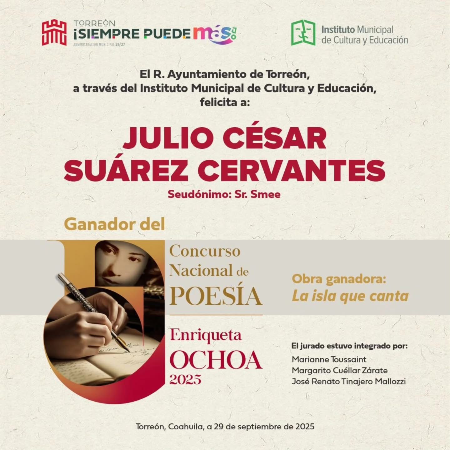 Anuncian ganador del Concurso Nacional de Poesía Enriqueta Ochoa 2025